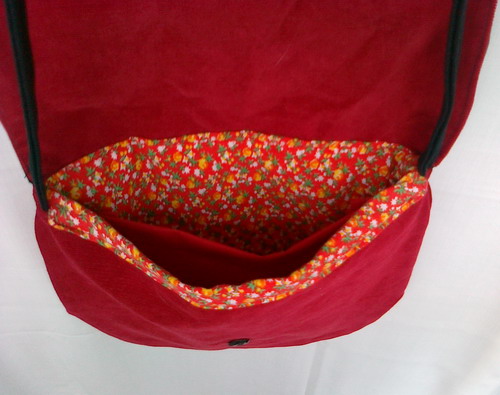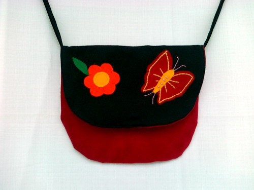 Poseta handmade rosie cu negru, cu floare si fluture din fetru brodat